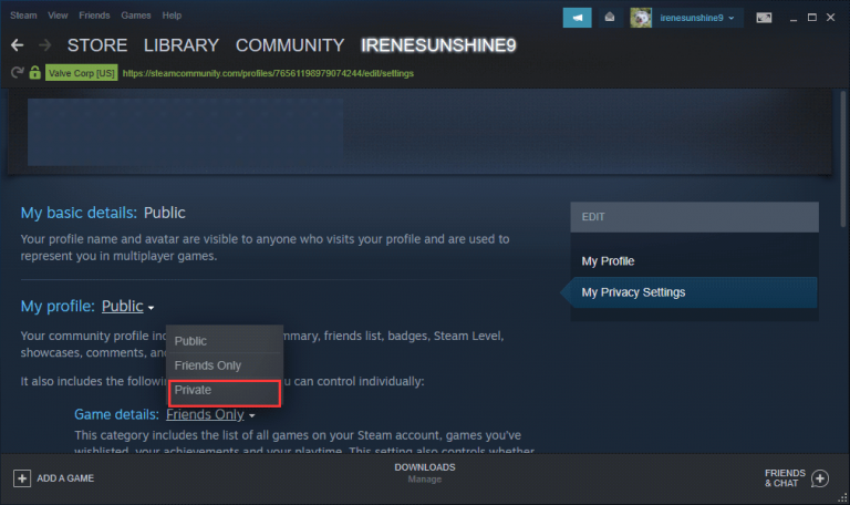 Remarque: rendre votre profil privé affectera votre liste d’amis, les détails du jeu, l’inventaire et les droits de publication de commentaires.